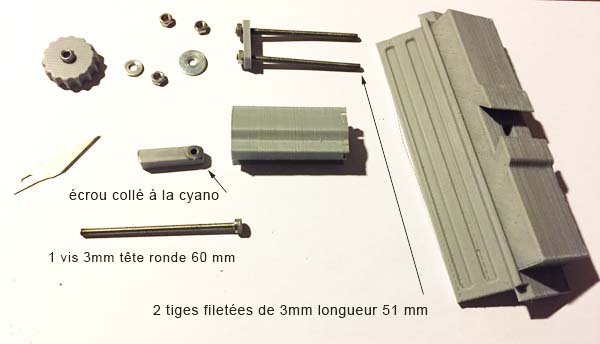 Cet axe reçoit un écrou de 3mm qui doit être ajusté et rentré de force en le chauffant au préalable, collé à la cyano, puis poncé pour que le tout puisse coulisser librement dans le carré.